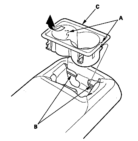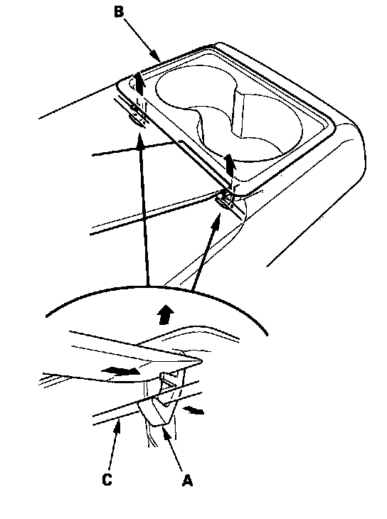 1. Using the appropriate trim tool, push on the rear hooks (A) to pull up the beverage holder (B), then release the hooks from the wire (C).