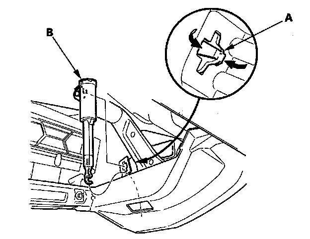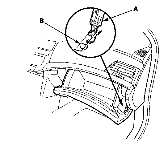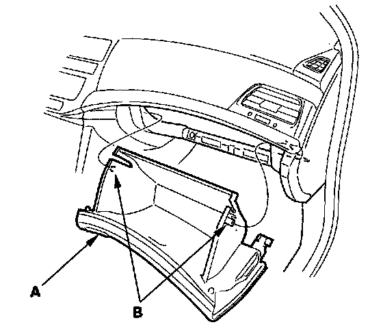2. Disconnect the glove box damper (A) from the pivot (B) on the glove box.