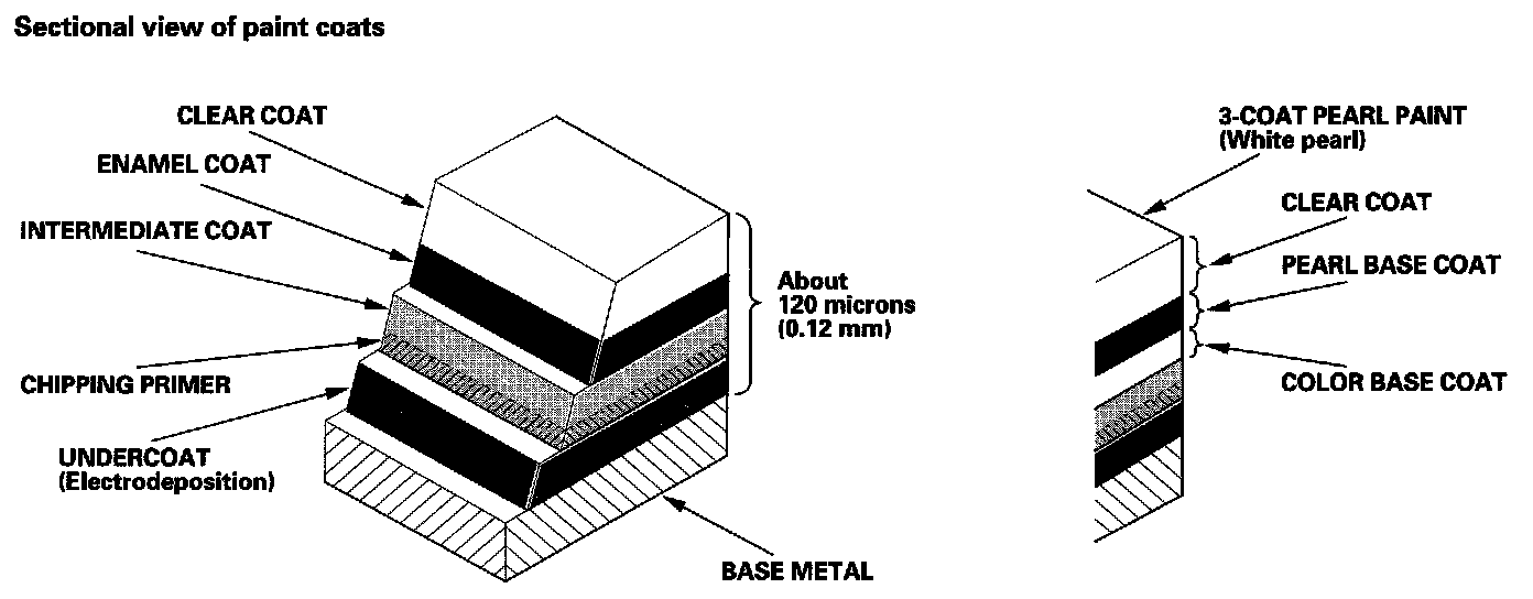 The 3-coat-3-bake (3C-3B) paint finish gives the Accord a deep gloss and stunning finish. This database provides information on paint defects, repair, and refinishing. Throughout, the objective is to explain in a simple yet comprehensive manner the basic items you should know about paint repairs. Select the correct material for the defect and repaint or refinish in the correct manner as described in this database.