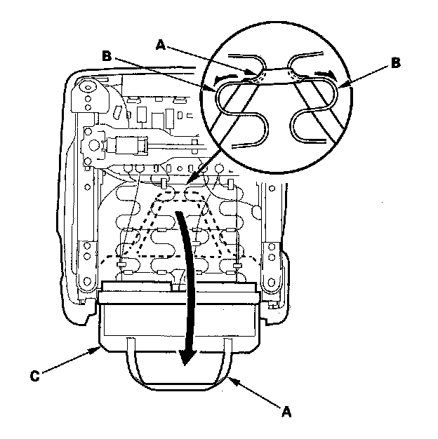 6. Release airbag wire A and airbag wire B from the seat-back frame (C).