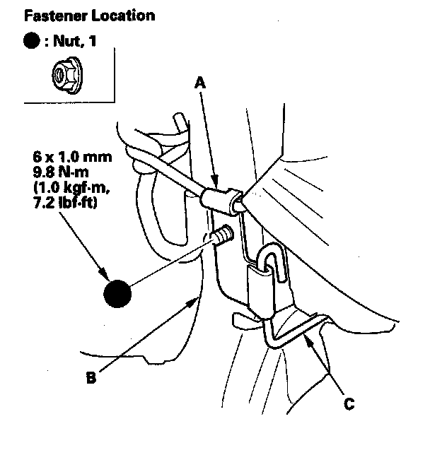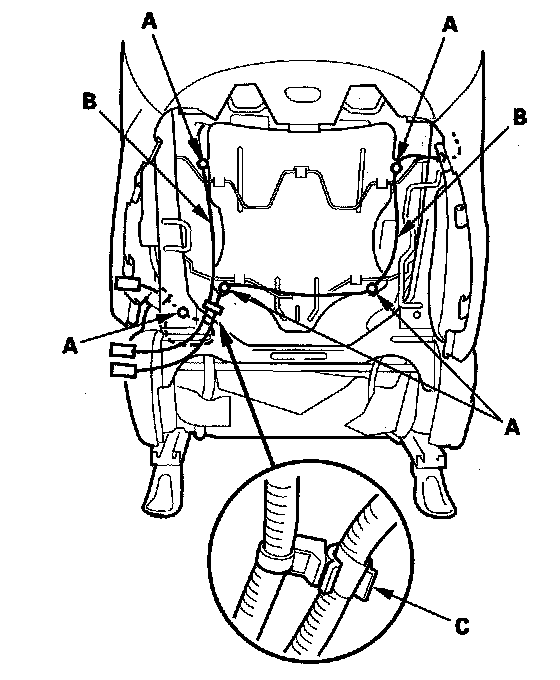 5. Remove the nut, then release the bracket (A) of airbag wire C from the seat-back frame (B).