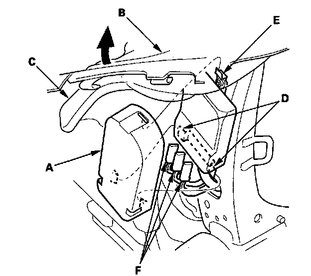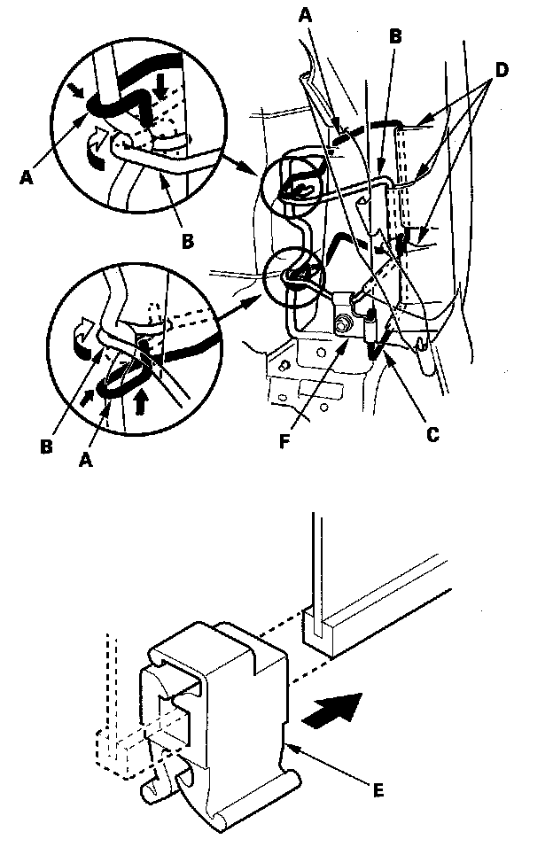 - Reinstall airbag wire A, B, and the bracket (F) of airbag wire C securely.