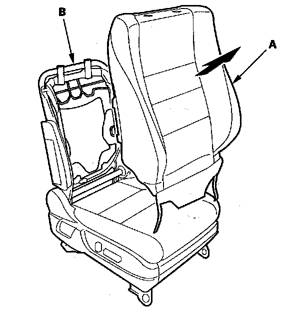11. Remove the seat-back cover/pad (A) from the seat-back frame (B).