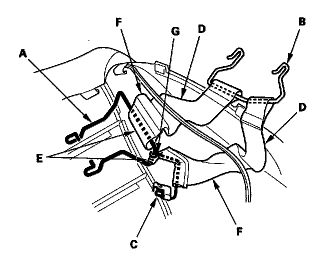 13. Remove airbag wire B from the outside reinforcing cloths (D). Pull the airbag wire A out through loops (E) of the inside reinforcing cloths (F) and through a loop (G) of airbag wire C, then remove the wires.
