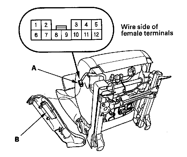 3. Disconnect the 12P connector (A) from the power seat adjustment switch (B).