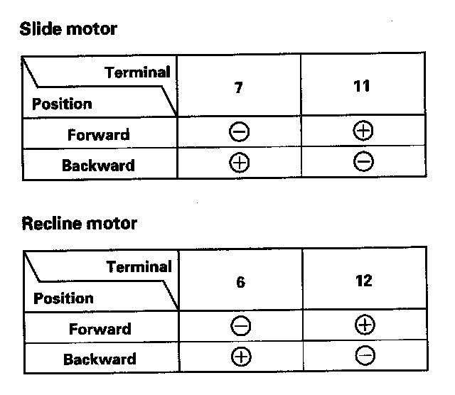 4. At the 12P connector of the front passenger's seat wire harness side, test the motor by applying battery power and ground to the terminals according to the table.