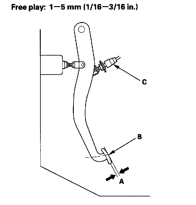 1. With the ignition switch at LOCK (0), inspect the play (A) at the brake pedal pad (B) by pushing the brake pedal by hand. If the brake pedal free play is out of specification, adjust the brake pedal position switch (C). If the brake pedal free play is insufficient, it may result in brake drag.