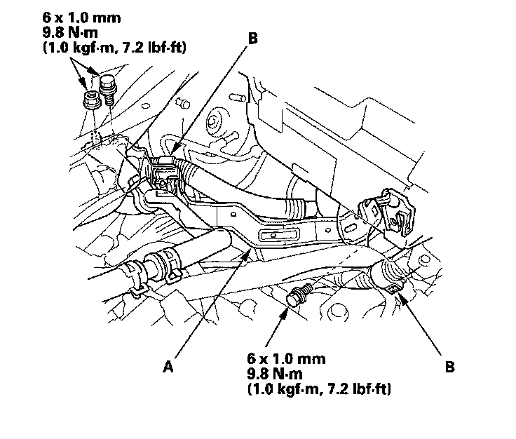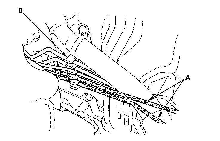 5. Remove the under-hood fuse/relay box bracket (A), then remove the engine wire harness clamps (B).