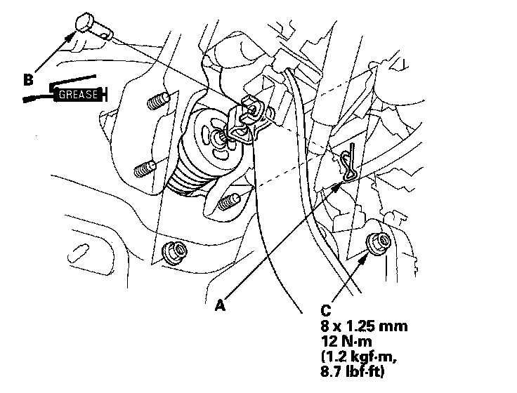 9. Remove the brake booster mounting nuts (C).
