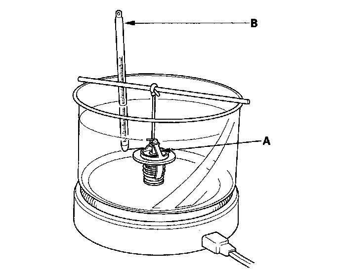 1. Suspend the thermostat (A) in a container of water. Do not let the thermometer (B) touch the bottom of the hot container.