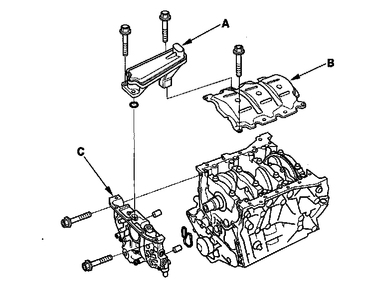 12. Remove the oil screen (A), the baffle plate (B), and the oil pump (C).