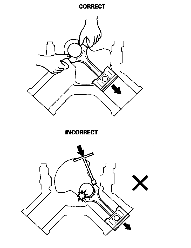 14. Remove the connecting rod caps after setting the crank pin at bottom dead center (BDC) for each cylinder. Remove the piston/connecting rod assembly by pushing on the connecting rod. Take care not to damage the oil jets, the crank pin, or the cylinder with the connecting rod.