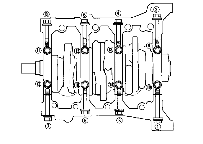 19. Loosen the bearing cap bolts and the bearing cap side bolts in sequence 1/3 turn at a time; repeat the sequence until all bolts are loosened.