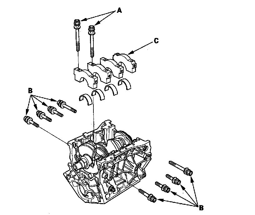 20. Remove the bearing cap bolts (A) and the bearing cap side bolts (B), then remove the bearing caps (C).