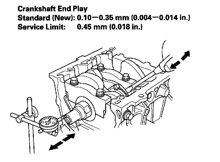 6. If the end play is excessive, replace the thrust washers and recheck. If it is still beyond the service limit, replace the crankshaft.