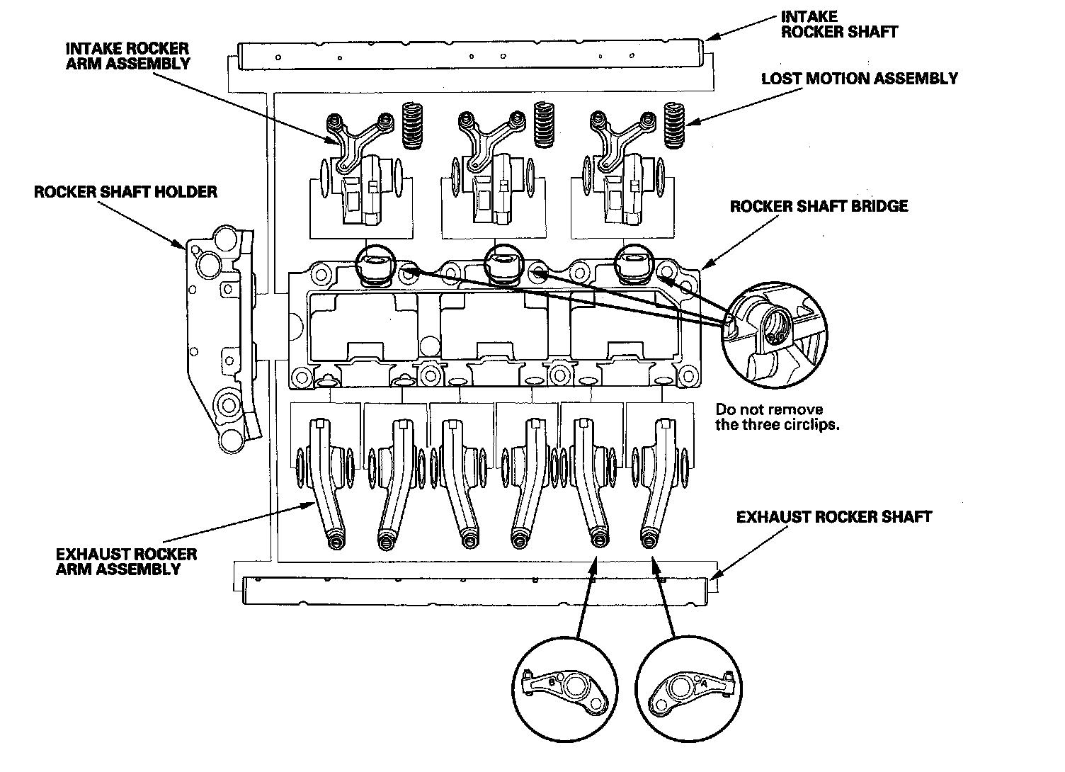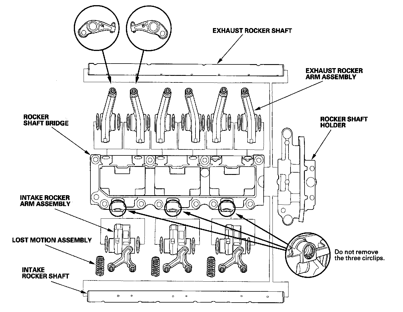^ Never remove any of the circlips that retain the lost motion assemblies in the rocker shaft bridge. The circlips are not available separately, and are factory installed in the rocker shaft bridge. To remove the lost motion assemblies, first remove the rocker shafts and the rocker arms.