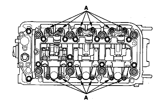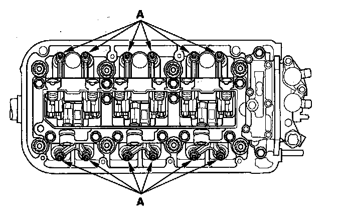 - 2 When removing the rocker arm assembly, do not remove the rocker shaft bridge mounting bolts and the rocker shaft holder mounting bolts. The bolts will keep the rocker arms on the shafts.