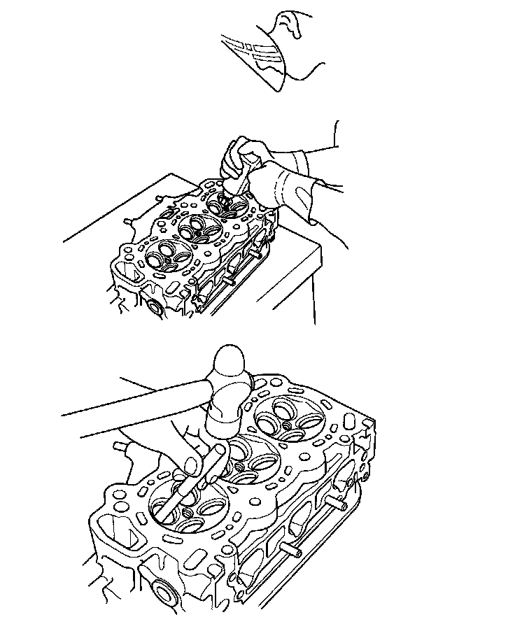 5. Working from the camshaft side, use the driver and an air hammer to drive the guide about 2 mm (0.1 in.) towards the combustion chamber. This will knock off some of the carbon and make removal easier. Hold the air hammer directly in line with the valve guide to prevent damaging the driver. Wear safety goggles or a face shield.
