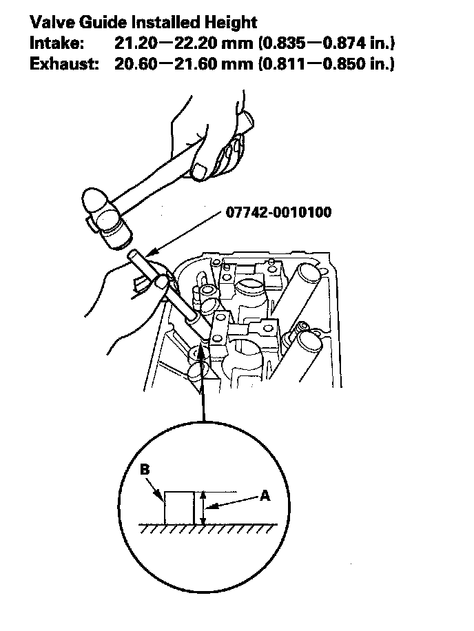 9. Apply a thin coat of new engine oil to the outside of the new valve guide. Install the guide from the camshaft side of the head; use the valve guide driver to drive the guide to the specified installed height (A) of the guide (B). If you have all 12 guides to do, you may have to reheat the head.