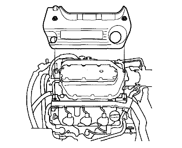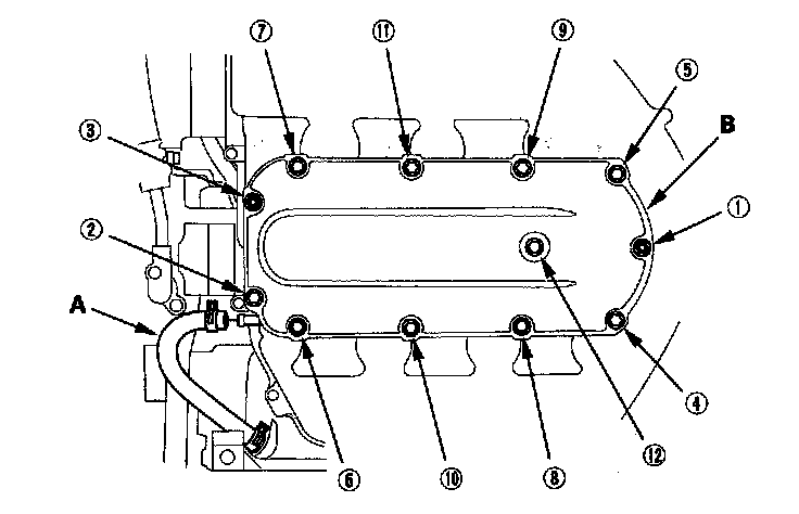 6. J35Z2 engine: Remove the positive crankcase ventilation (PCV) hose (A), then remove the upper cover mounting bolts and nuts sequentially in three steps, then remove the upper cover (B).