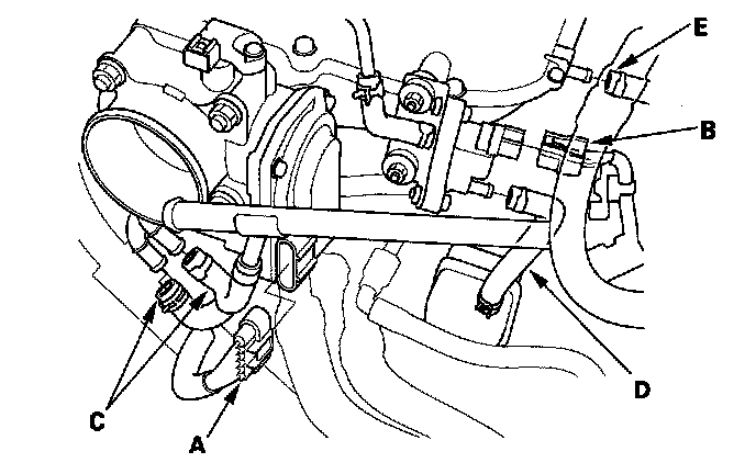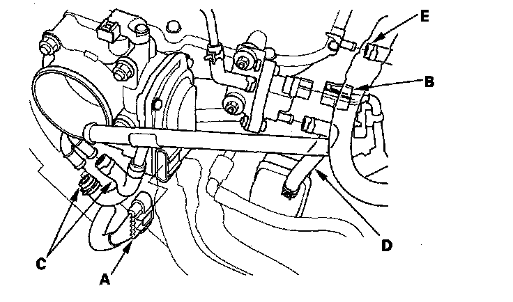 4. J35Z2 engine: Connect the throttle actuator connector (A) and the evaporative emission (EVAP) canister purge valve connector (B), then install water bypass hoses (C), the EVAP hose (D), and the brake booster vacuum hose (E).
