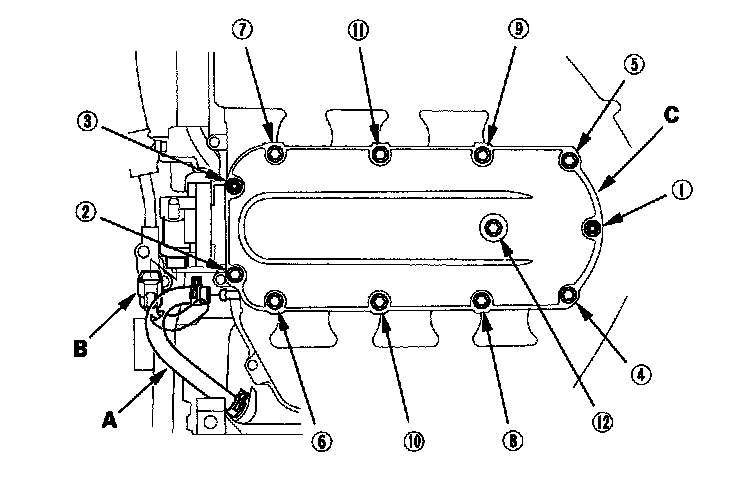 7. J35Z3 engine: Remove the positive crankcase ventilation (PCV) hose (A), and disconnect the intake manifold tuning (IMT) actuator connector (B), then remove the upper cover mounting bolts and nuts sequentially in tree steps, then remove the upper cover (C).