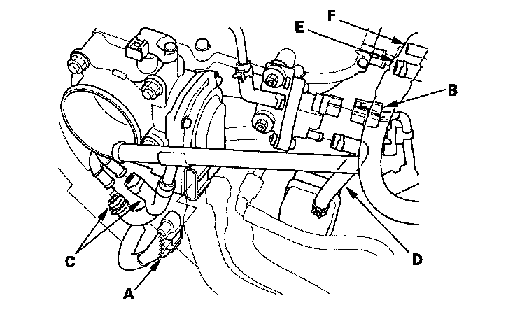 5. J35Z3 engine: Connect the throttle actuator connector (A) and the evaporative emission (EVAP) canister purge valve connector (B), then install the water bypass hoses (C), the EVAP hose (D), brake booster vacuum hose (E), and vacuum hose (F).