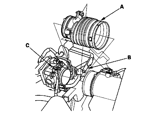 6. Install the intake air duct (A) and the breather pipe (B), then connect the manifold absolute pressure (MAP) sensor connector (C).