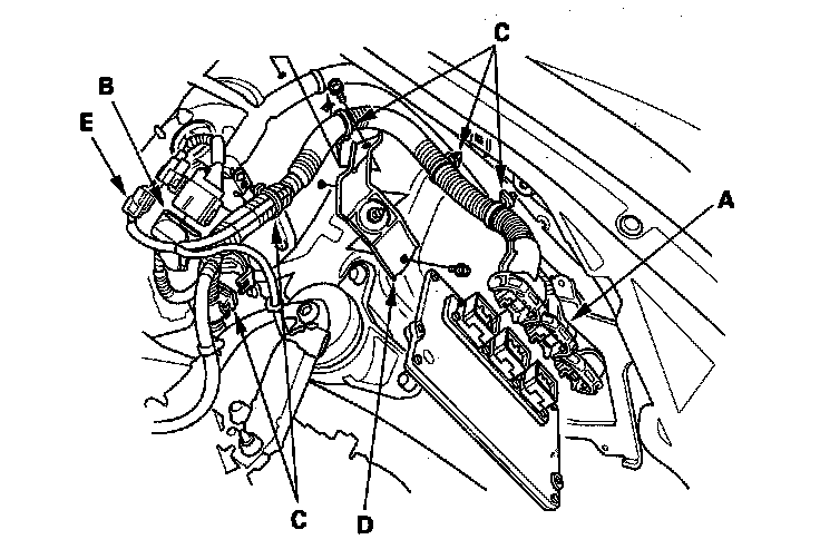 11. Disconnect the ECM/PCM connectors (A), the engine wire harness connector (B), the harness clamps (C), and the bracket (D).