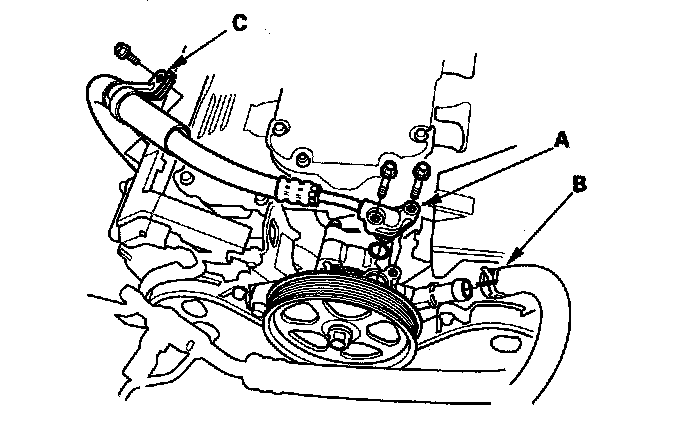 16. Remove the power steering (P/S) pump outlet line (A) and the P/S pump inlet line (B) from the P/S pump and remove the P/S hose bracket (C), then plug the outlet line and the P/S pump.