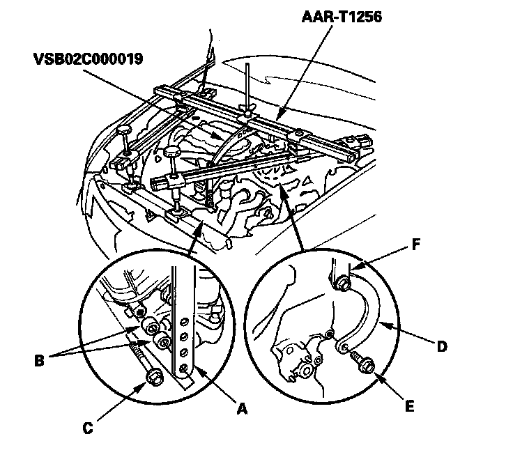 44. Lift and support the engine with the engine support hanger (AAR-T1256) and the engine hanger balance bar (VSB02C000019). Attach the front arm (A) to the front cylinder head with several spacers (B) and the bolt (10 x 1.25 mm) (C). Attach the 2008 V6 attachment arm (D) to the rear cylinder head and the bolt (8 x 1.25 mm) (E), then attach the rear arm (F) to the 2008 V6 attachment arm.