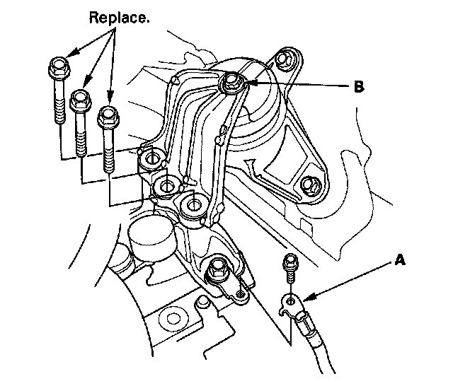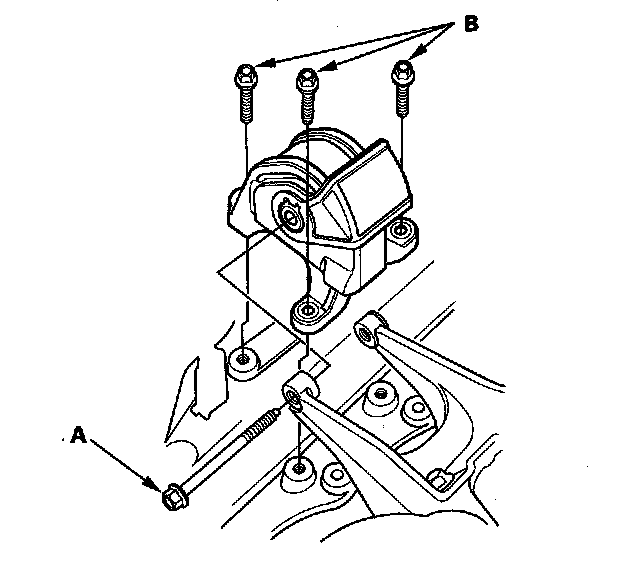 NOTE: Do not remove the TORX bolt (B) from the upper transmission mount. If the TORX bolt is removed, the upper transmission mount must be replaced as an assembly.