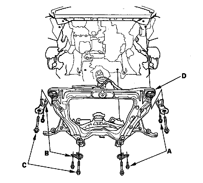 55. Remove the four 12 x 1.25 mm bolts (A) securing the subframe stiffeners (B), the four subframe mounting bolts (C), and the stiffeners, then lower the front subframe (D).