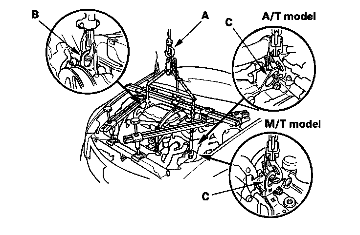 57. Attach a chain hoist (A) to the engine hook (B) and the transmission hook (C), then lift the engine/transmission until it is securely supported by the chain hoist, and remove the engine support hanger and the engine hanger balance bar.
