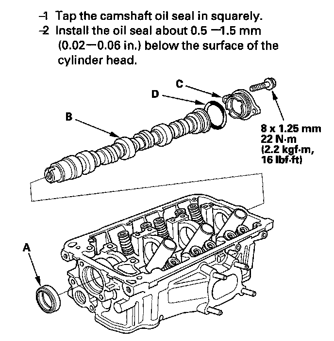 4. Insert the camshaft (B) into the cylinder head, then install the camshaft thrust cover (C). Always use a new O-ring (D). Apply new engine oil to the camshaft journals and lobes.