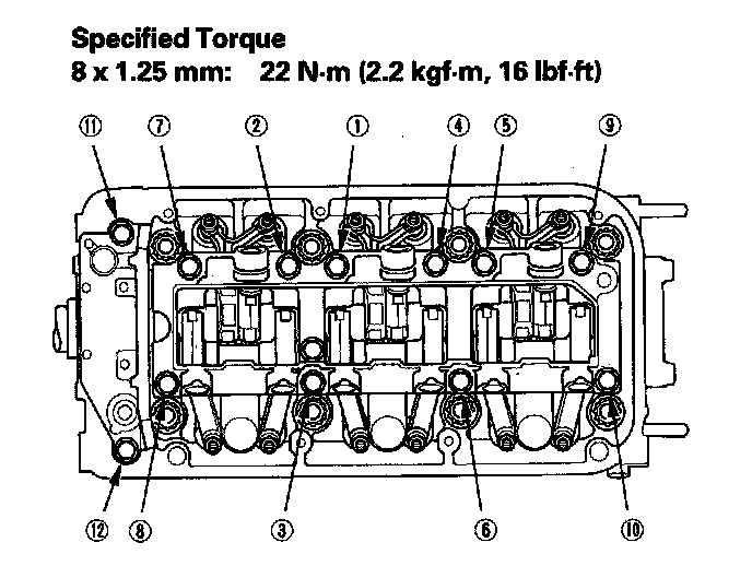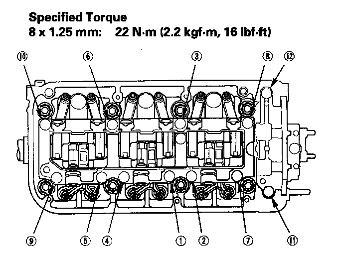 10. Tighten each bolt two turns at a time in the sequence shown to ensure that the rockers do not bind on the valves.