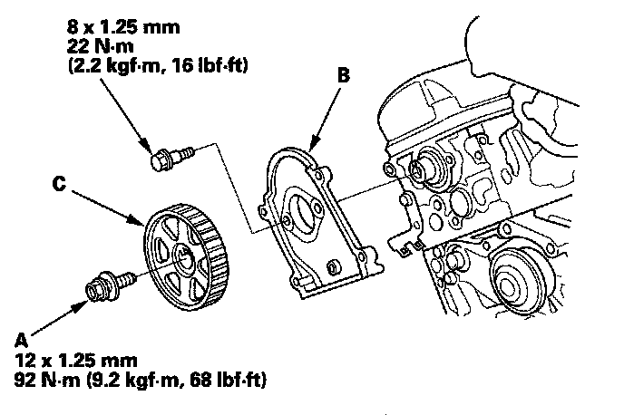 12. Apply new engine oil to the threads of the camshaft pulley mounting bolt (A). Install the back cover (B), then install the camshaft pulley (C).