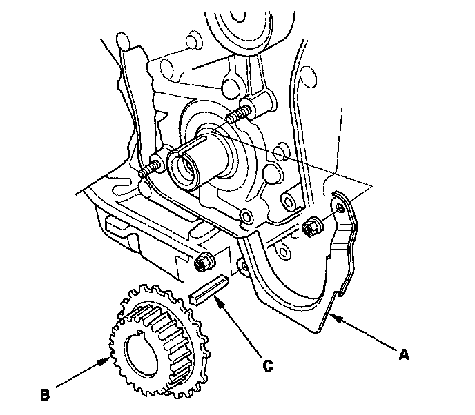 2. Remove the timing belt stopper (A), then remove the timing belt drive pulley (B). and the key (C).