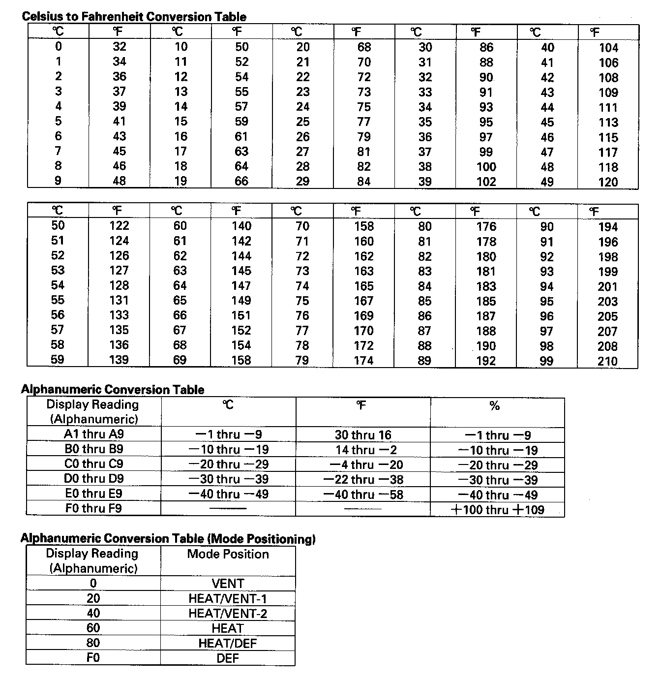 - The sensor values will be displayed in degrees Celsius (°C) or an alphanumeric code. Use the chart to convert the value to degrees Fahrenheit (°F).