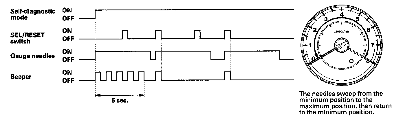 When entering the self-diagnostic mode, the speedometer, the tachometer, the fuel gauge and the engine coolant temperature gauge needles sweep from the minimum position to maximum position, then return to the minimum position.