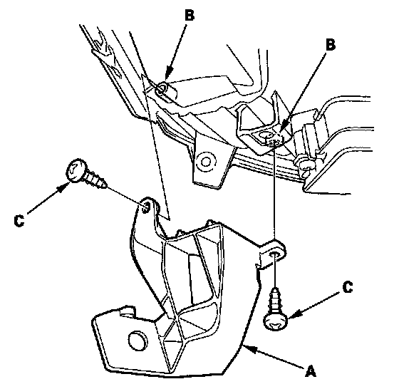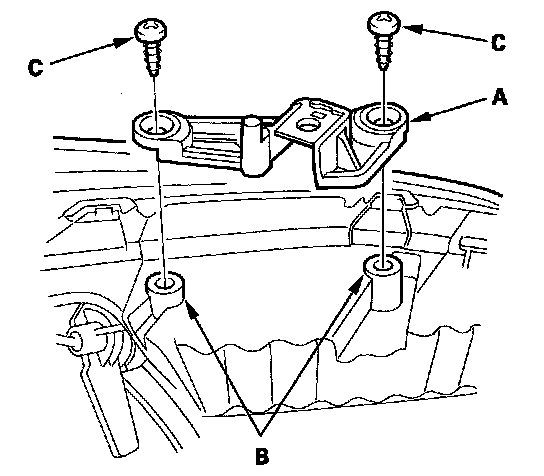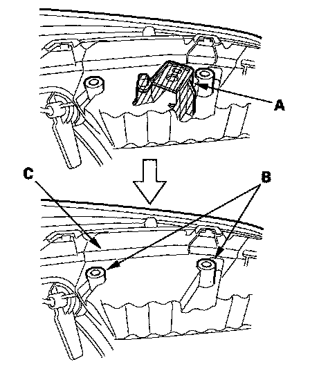 4. Install the upper repair bracket (A) on the bosses of the headlight housing (B), then fasten it with the screws (C) provided with the repair bracket.
