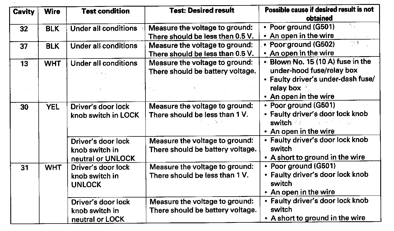 4. Reconnect the connectors to the driver's under-dash fuse/relay box, and make these input tests at the connectors.