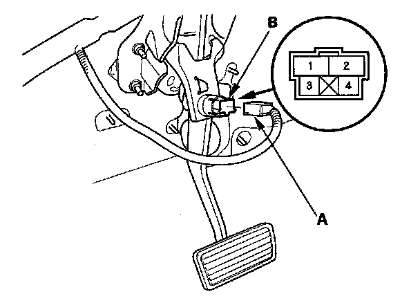 Brake Pedal Position Switch Test1. Disconnect the 4P connector (A) from the brake pedal position switch (B).