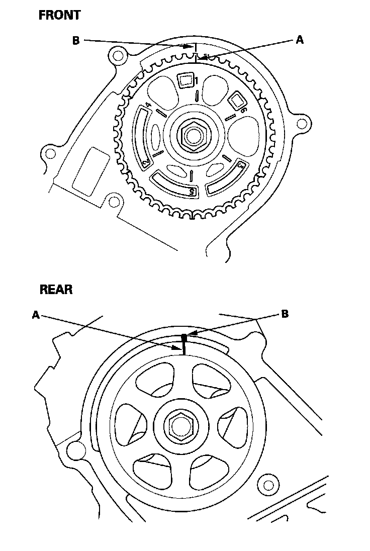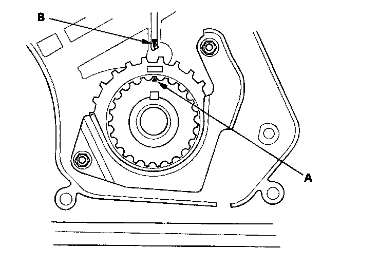 2. Set the timing belt drive pulley to top dead center (TDC) by aligning the TDC mark (A) on the tooth of the timing belt drive pulley with the pointer (B). on the oil pump.