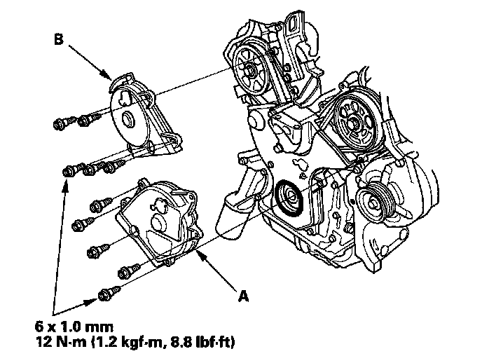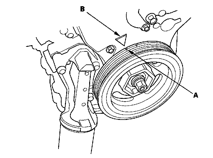 15. Turn the crankshaft pulley so its white mark (A) lines up with the pointer (B).