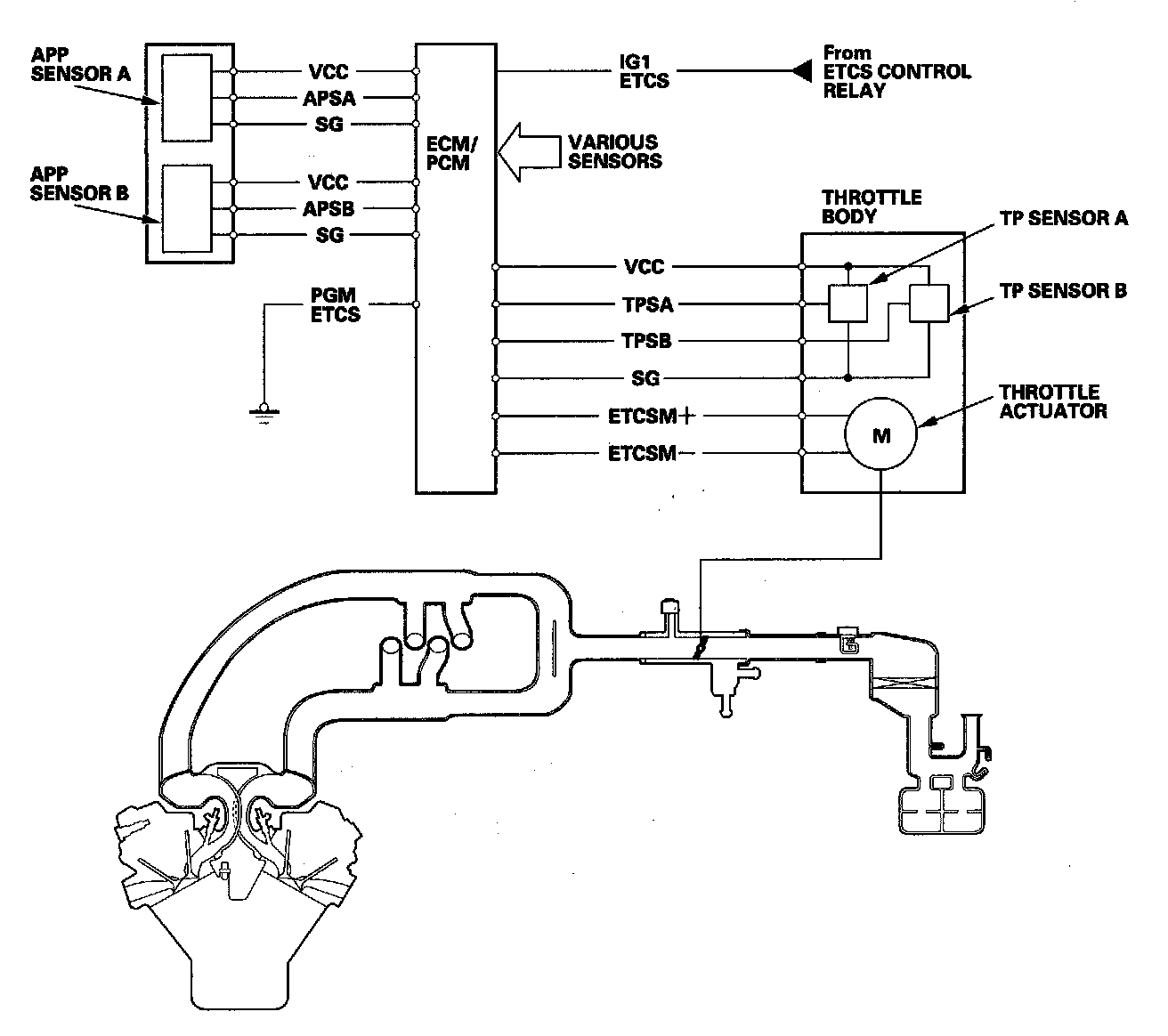 The electronic throttle control system consists of the throttle actuator, throttle position (TP) sensor A/B, accelerator pedal position (APP) sensor A/B, the electronic throttle control system (ETCS) control relay, and the ECM/PCM.