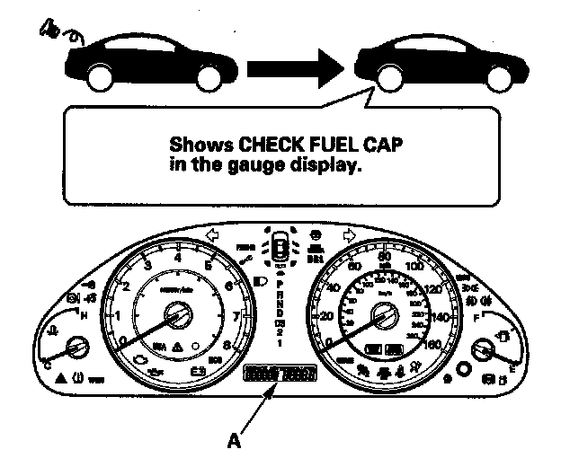 The first time a leak is detected a CHECK FUEL CAP message appears on the gauge display (A). To scroll to another message, press the select/reset button. The"CHECK FUEL CAP" message will appear each time you restart the engine until the system turns the message off. Turn the engine off then replace or tighten the fuel fill cap until it clicks at least once.