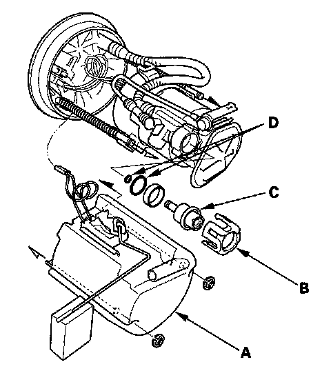 5. Install the parts in the reverse order of removal with new O-rings (D) and a new bracket. When installing the fuel tank unit, align the marks on the unit and the fuel tank.