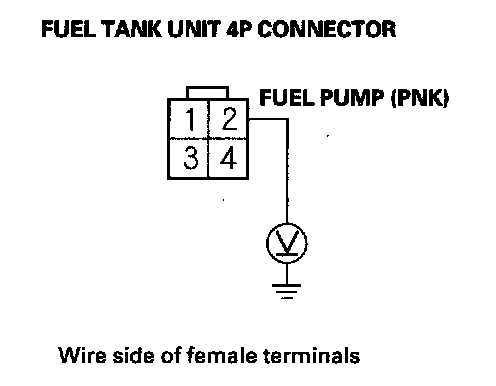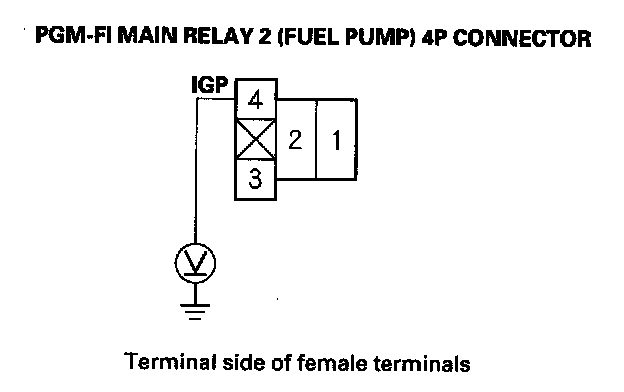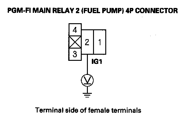 5. Measure the voltage between PGM-FI main relay 2 (FUEL PUMP) 4P connector terminal No. 4 and body ground.
