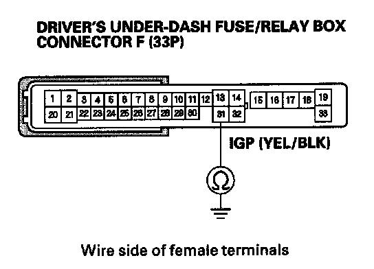 12. Check for continuity between driver's under-dash fuse/relay box connector F (33P) terminal No. 31 and body ground.